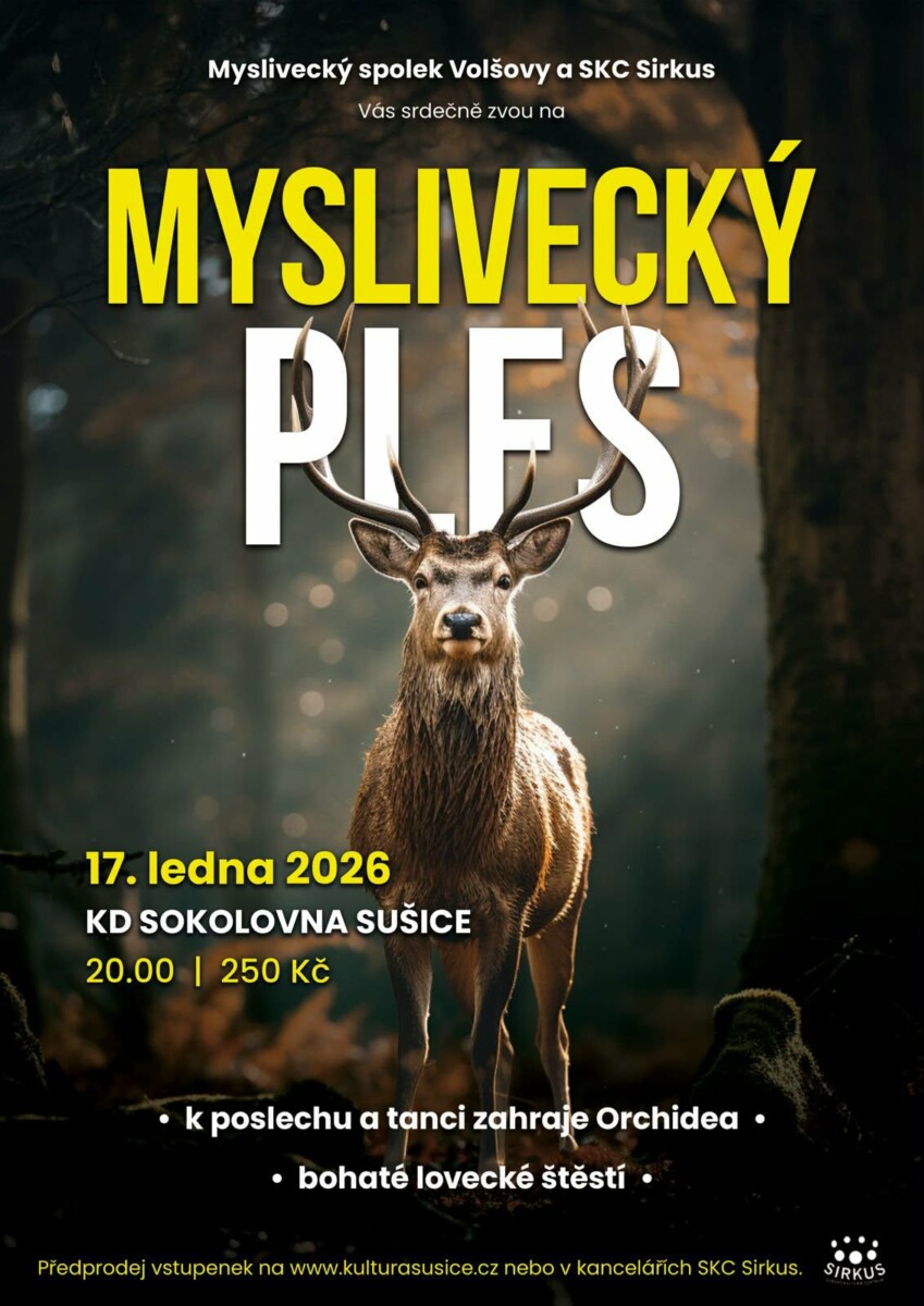 Myslivecký spolek Volšovy a Sirkus – Sušické kulturní centrum Vás srdečně zvou na Myslivecký ples, který se uskuteční v sobotu 17. 1. 2026 od 20 hodin v sušickém KD Sokolovna. K tanci i poslechu zahraje skupina Orchidea.