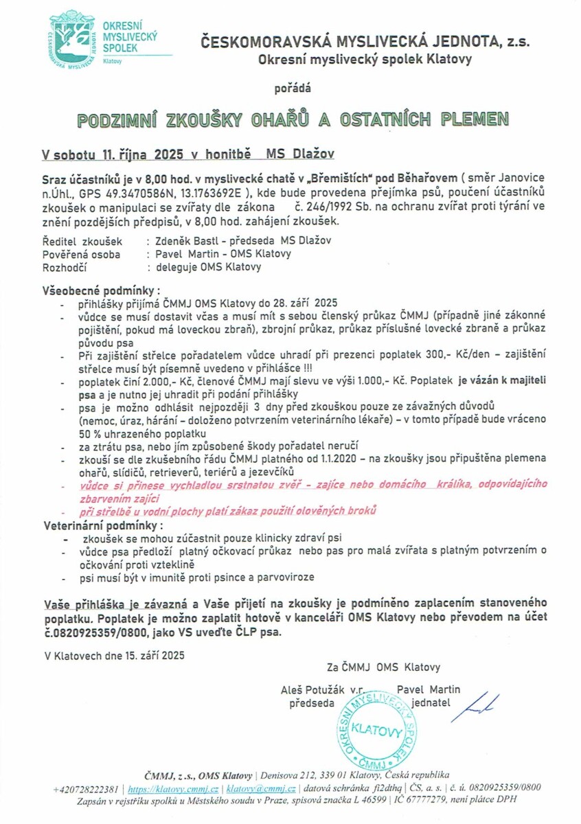 Propozice – PODZIMNÍ ZKOUŠKY OHAŘŮ A OSTATNÍCH PLEMEN, které se konají v sobotu 11. října 2025 v honitbě MS Dlažov. Stále přijímáme přihlášky: klatovy@cmmj.cz