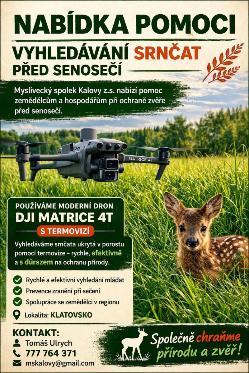 Myslivecký spolek Kalovy nabízí pomoc zemědělcům a hospodářům na Klatovsku při vyhledávání srnčat ukrytých v porostech před senosečí. Pomocí moderního dronu s termovizí dokážeme mláďata rychle a efektivně najít a předejít tak jejich zranění. Společně tak chráníme přírodu i zvěř.